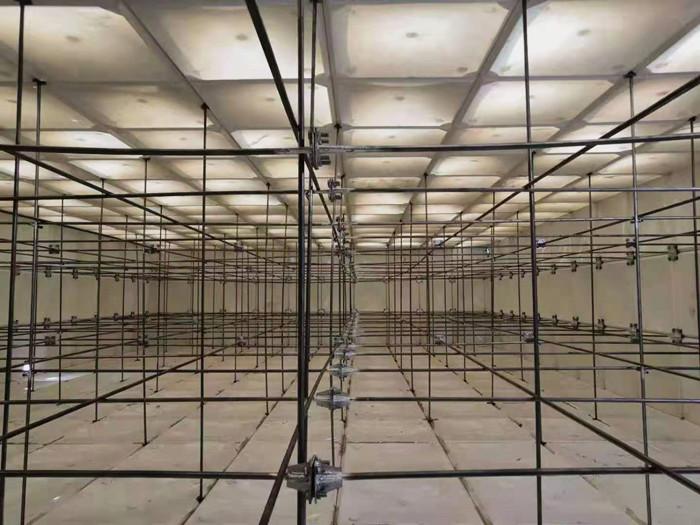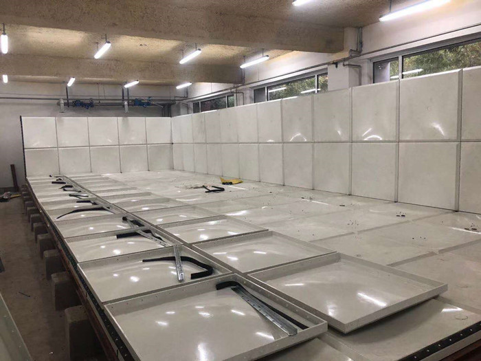 焊接玻璃鋼水箱底板,焊縫均勻整齊,不得有氣泡、焊坑,在底板上組裝點(diǎn)焊玻璃鋼水箱下側(cè)板四周,組裝前按圖紙要求選定相應(yīng)板厚的模塊,將模塊四周折邊敲正校平。先將下側(cè)板點(diǎn)焊于底板四周,點(diǎn)好后測量四周方框的兩條對角線長度誤差不得大于2mm,要已點(diǎn)焊后的下側(cè)模塊整體橫平豎直組合方正。